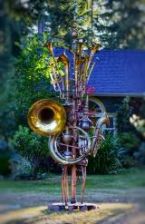 I met a new friend (Rick Underwood) last weekend at the Moss Street Paint In, in Victoria BC. He had recently been to Nelson BC where he happened upon my sculpture; 76 Trombones. He did a wonderful job of capturing the spirit of 76 Trombones and the results are below. Thanks Rick! The City of Nelson has leased this musical instrument sculpture for the next year from the Castlegar Sculpturewalk lease program.