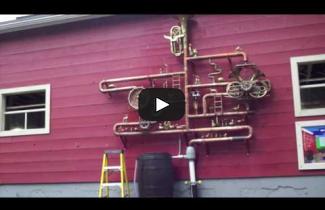A few weeks ago we completed installing a sculpture at Maplewood Farm in North Vancouver, BC. The sculpture was commissioned by the North Vancouver Regional District Arts Commission earlier this year and was intended to be a functional part of the farm’s rainwater collection system. Positioned between the barn eavestrough downspout and the rain barrel, the sculpture acts as an interceptor. Water Factory is a rainwater driven kinetic sculpture that embodies form and function; and was inspired by a big red barn wall. Thank you everyone at Maplewood Farm for your assistance and your chickens, ducks and cows that made for a wonderful working environment. Enjoy the accompanying video made by Ross Bodenmann documenting the process of installing a kinetic downspout sculpture.