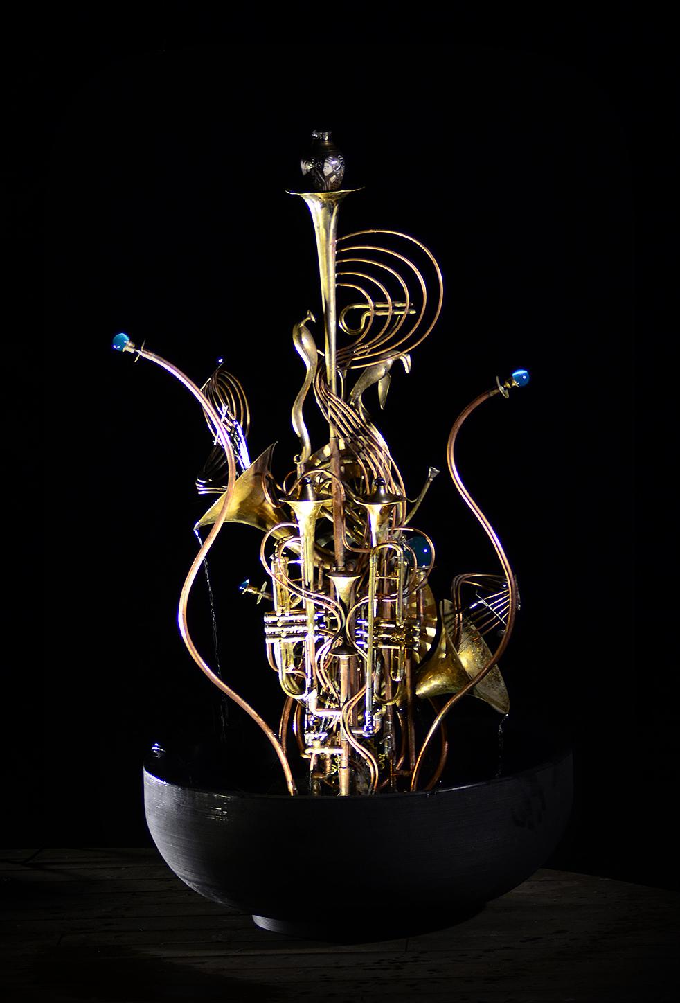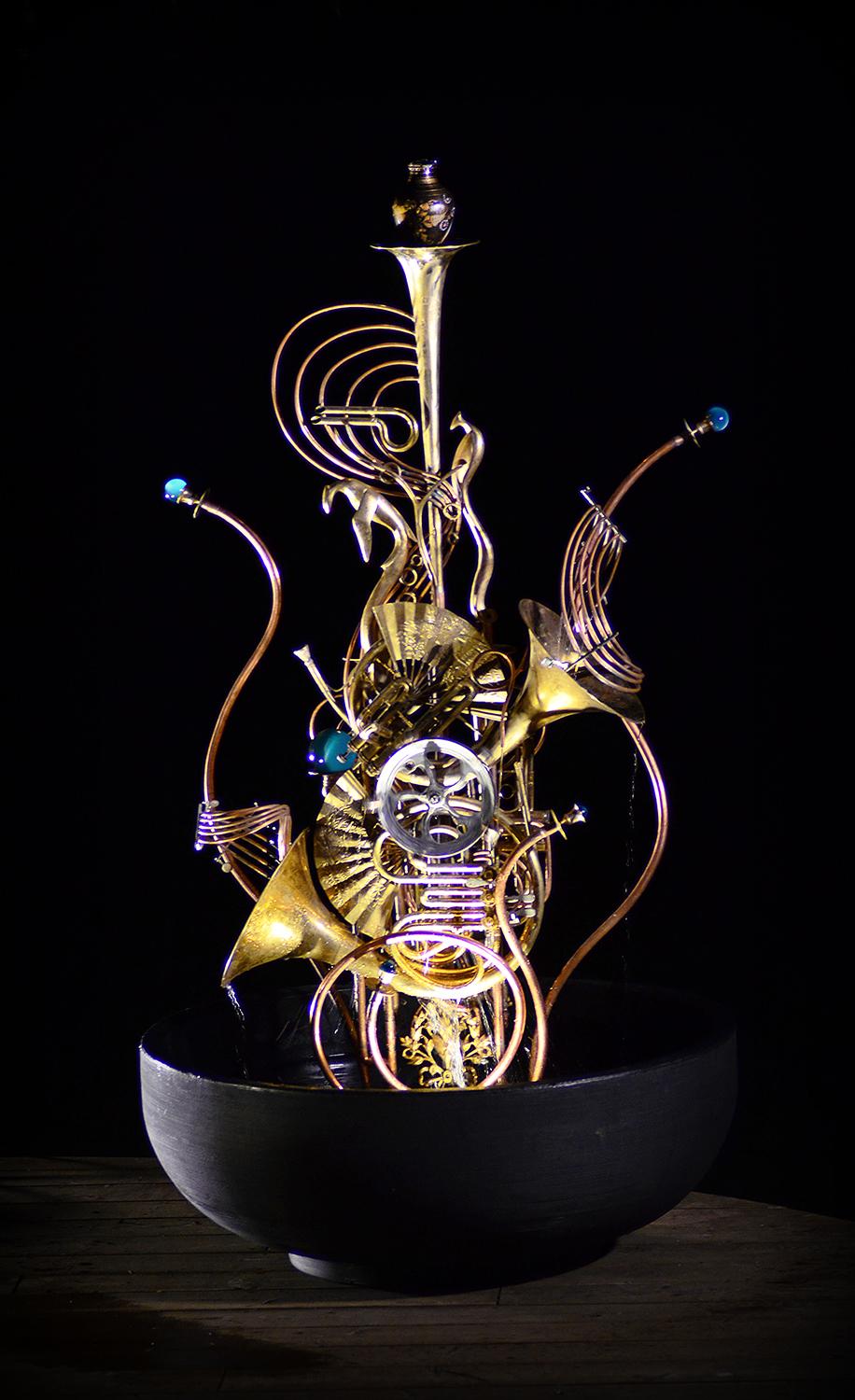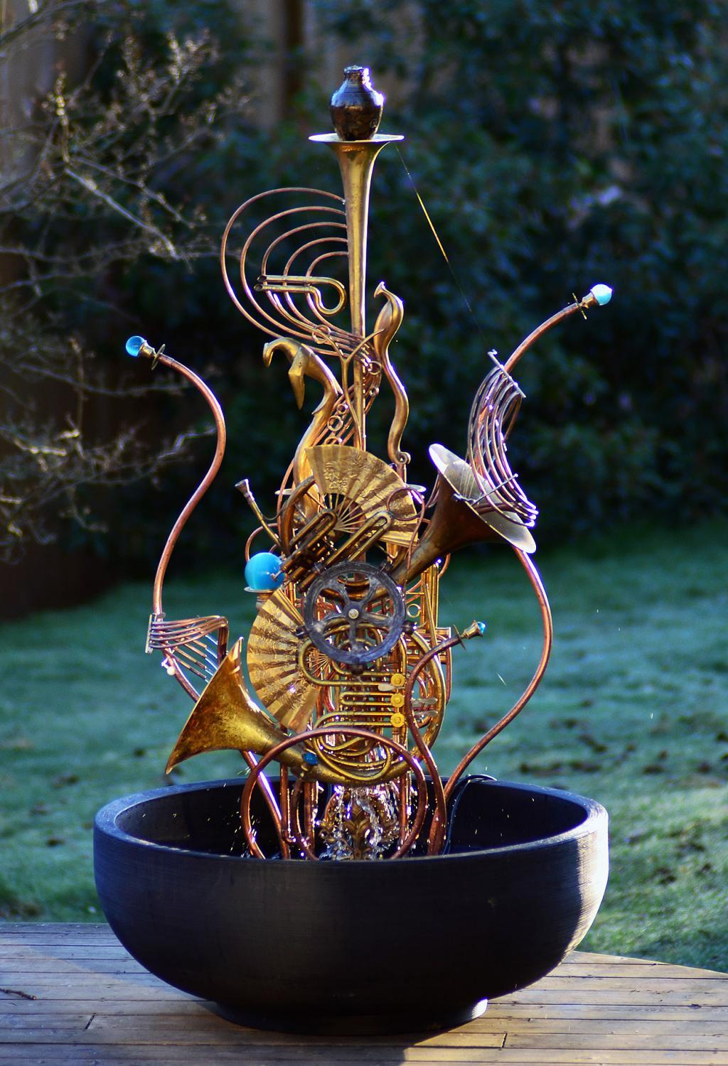 I love the design of my French Horn fountains. I call the series French Horn Union because of the way that I join the two French Horns together. It’s a classic S shape. So attractive. I’m not sure how many are in the series but I’m calling this one # 29. This musical instrument fountain has two French horns, a trombone and two trumpets. The latter have rolling balls placed in the bells for more kinetic aspects. The French horns each have a scroll of music that shoot streams of water back into the bells. There is a water driven wheel for action and three lovely aqua coloured glass balls. Over all this is one of my favourite fountains. PS: the sound of the falling water is remarkable on this piece.