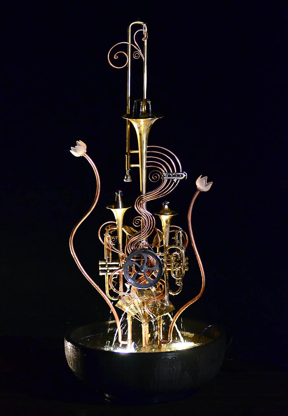 Created from an old trombone, a pair of trumpets, a brass vase, and a few candle holders; this is the latest in an amazing array of kinetic musical instrument fountains. The water wheel and spinning marbles create the kinetic aspect of this lovely piece.