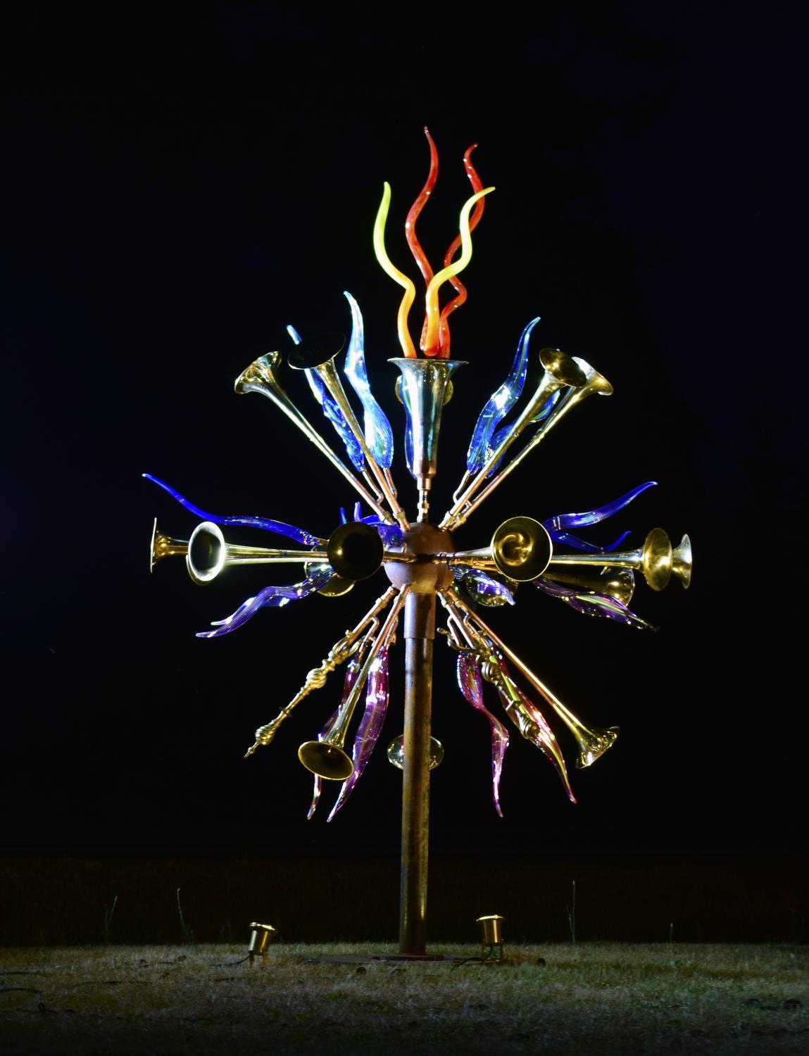 This commissioned sculpture measures six feet across and ten feet high. With twenty one trombones and twenty six pieces of blown glass Star Fire was installed on a ten foot pole at its final destination. A remarkable site to see. I am so very grateful that our clients are so capable of following my dreams. Cheers L&B, you both are so kind.