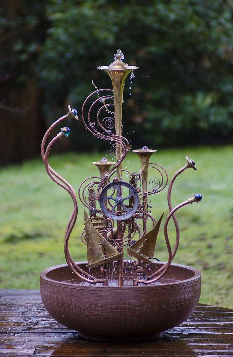 Its easy to create elegance in a water feature; just add a trombone, two trumpets and a collection of brass ornaments; then embellish with lovely, curved tubing. With three small brass sailboats, a water wheel and two water propelled marbles spinning inside the trumpet bells, the fountain becomes both elegant and sporty.